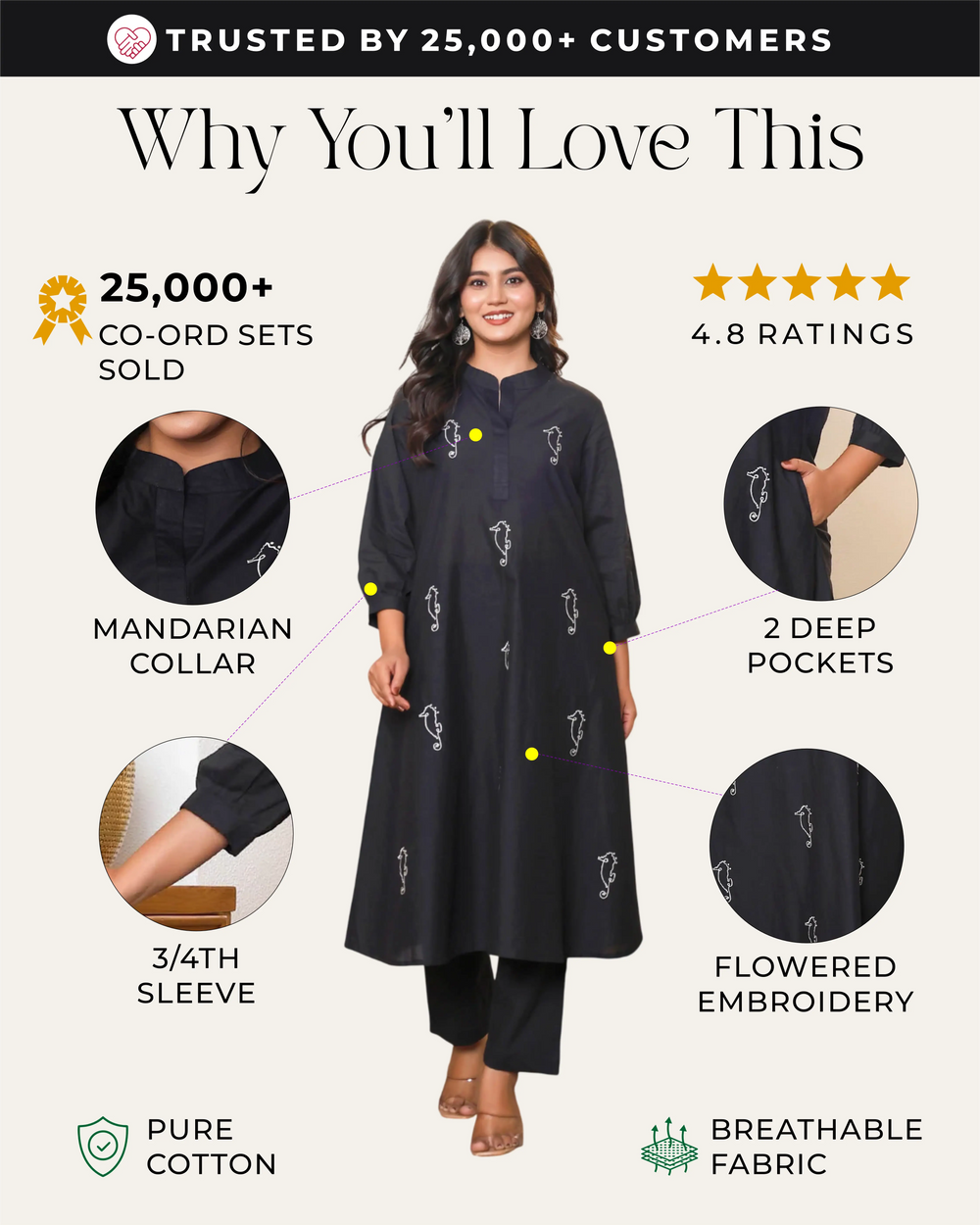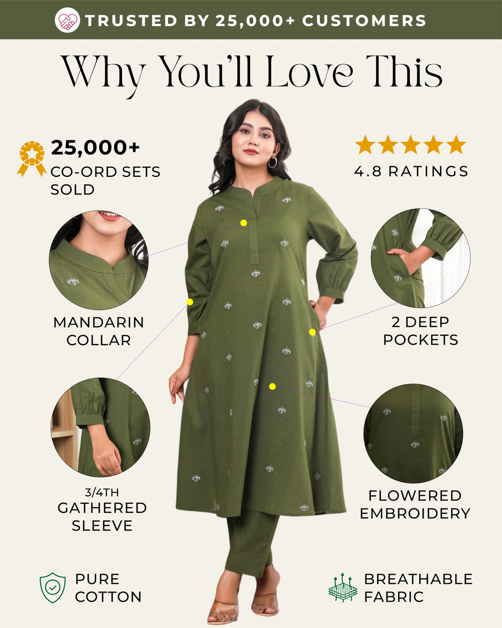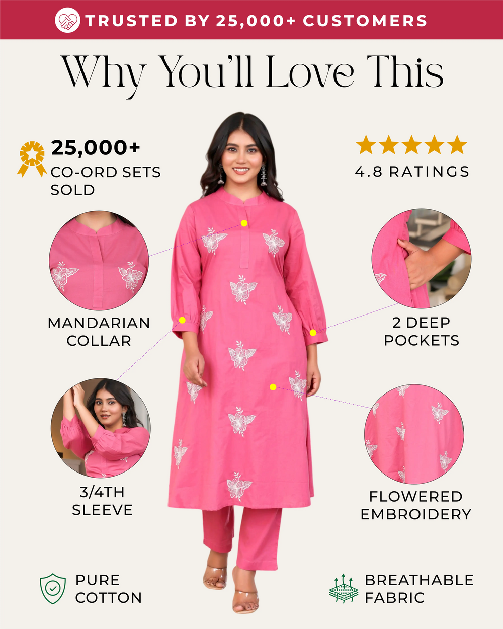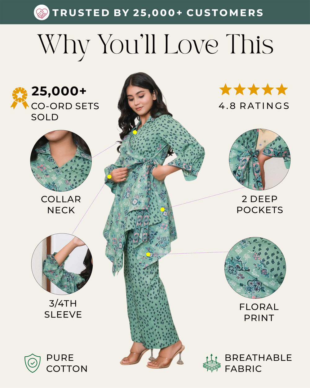 This co-ord set is a perfect blend of comfort and style. The soft cotton fabric feels great on the skin, and the hand-block leaf print adds a beautiful, earthy charm. Ideal for both everyday wear and special occasions!