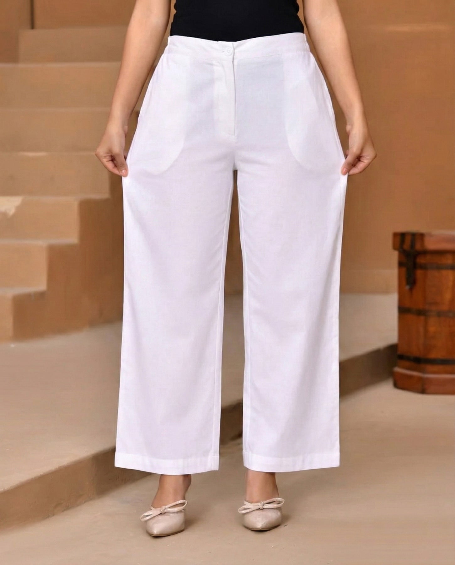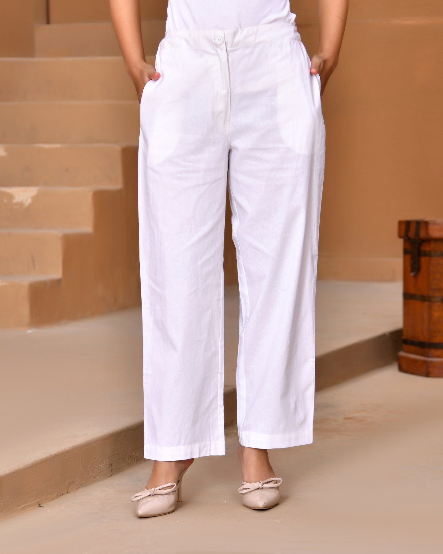 White Solid Straight Pants