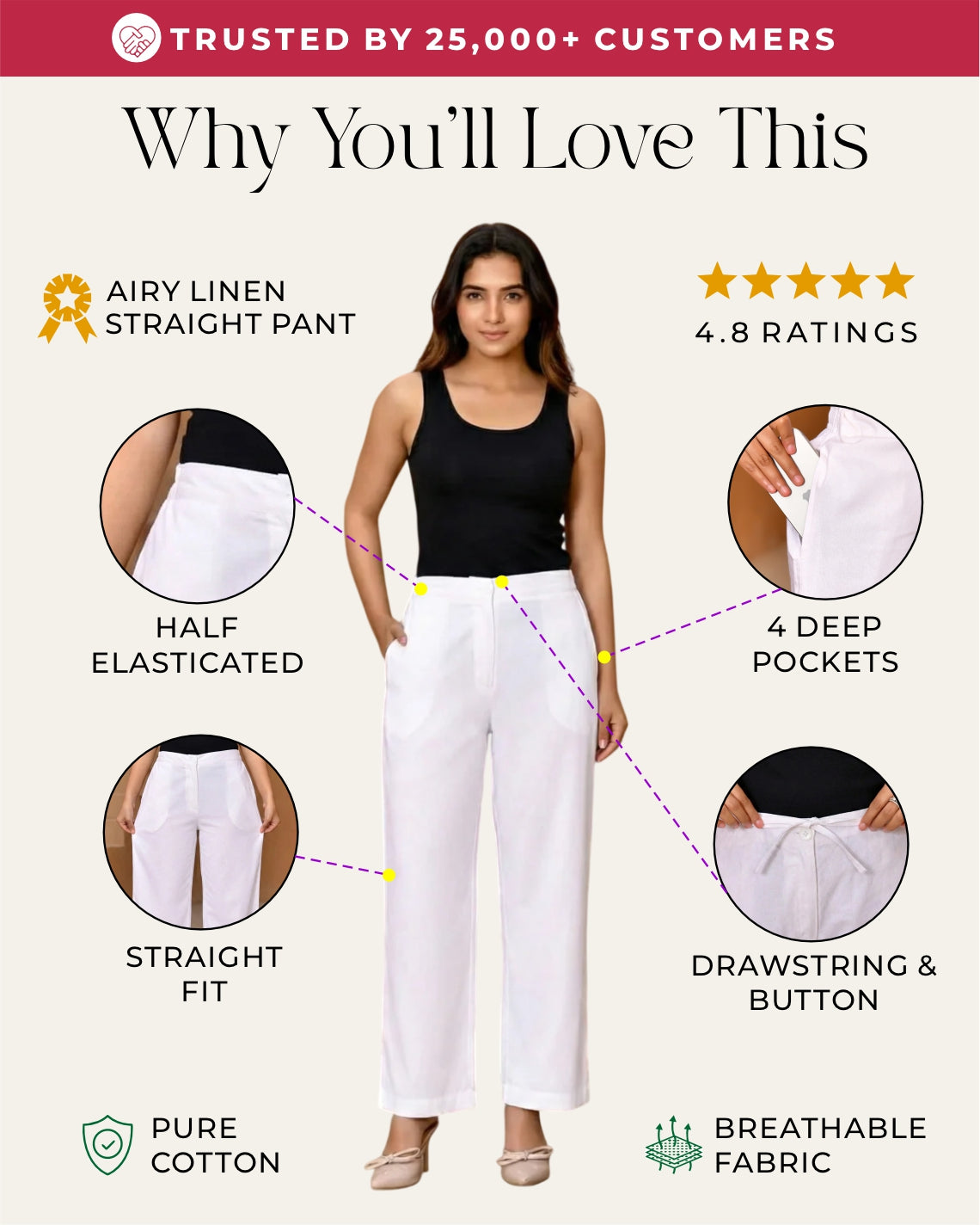 Design -Half-elastic waist | Drawstring & button | 2 side + 2 back pockets