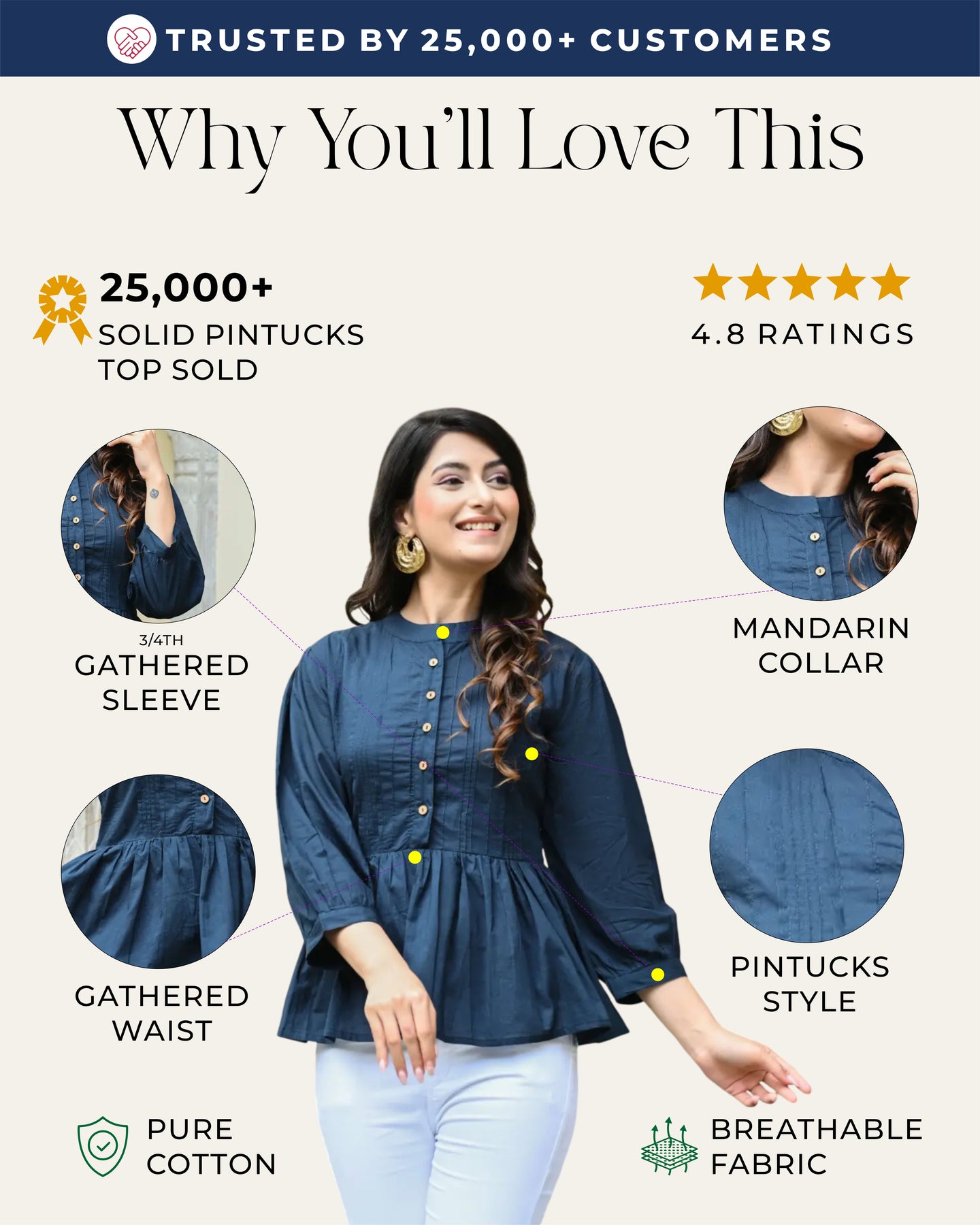 Dark Blue Solid Pintucks Top