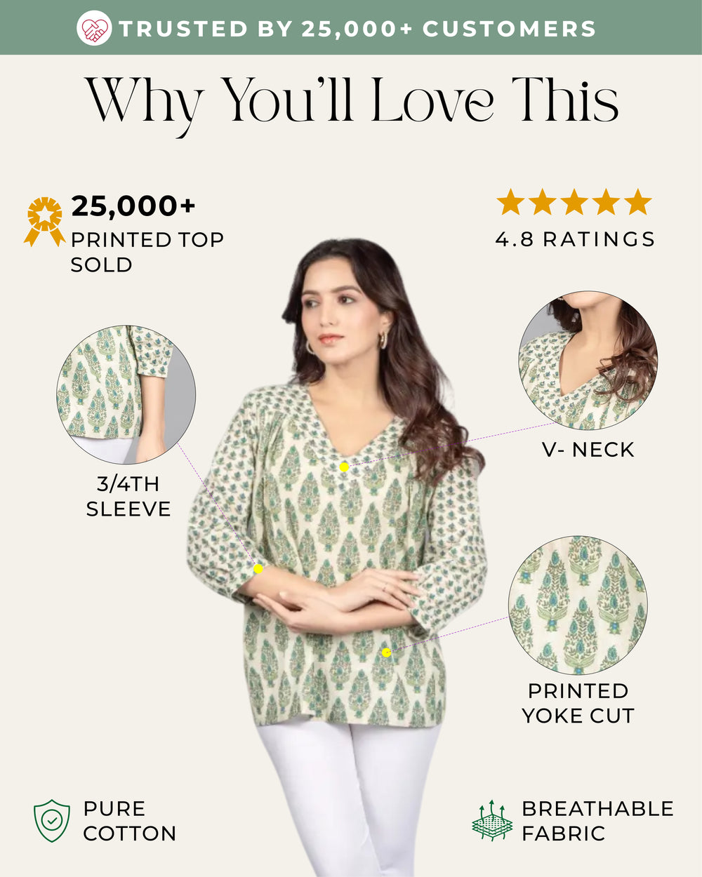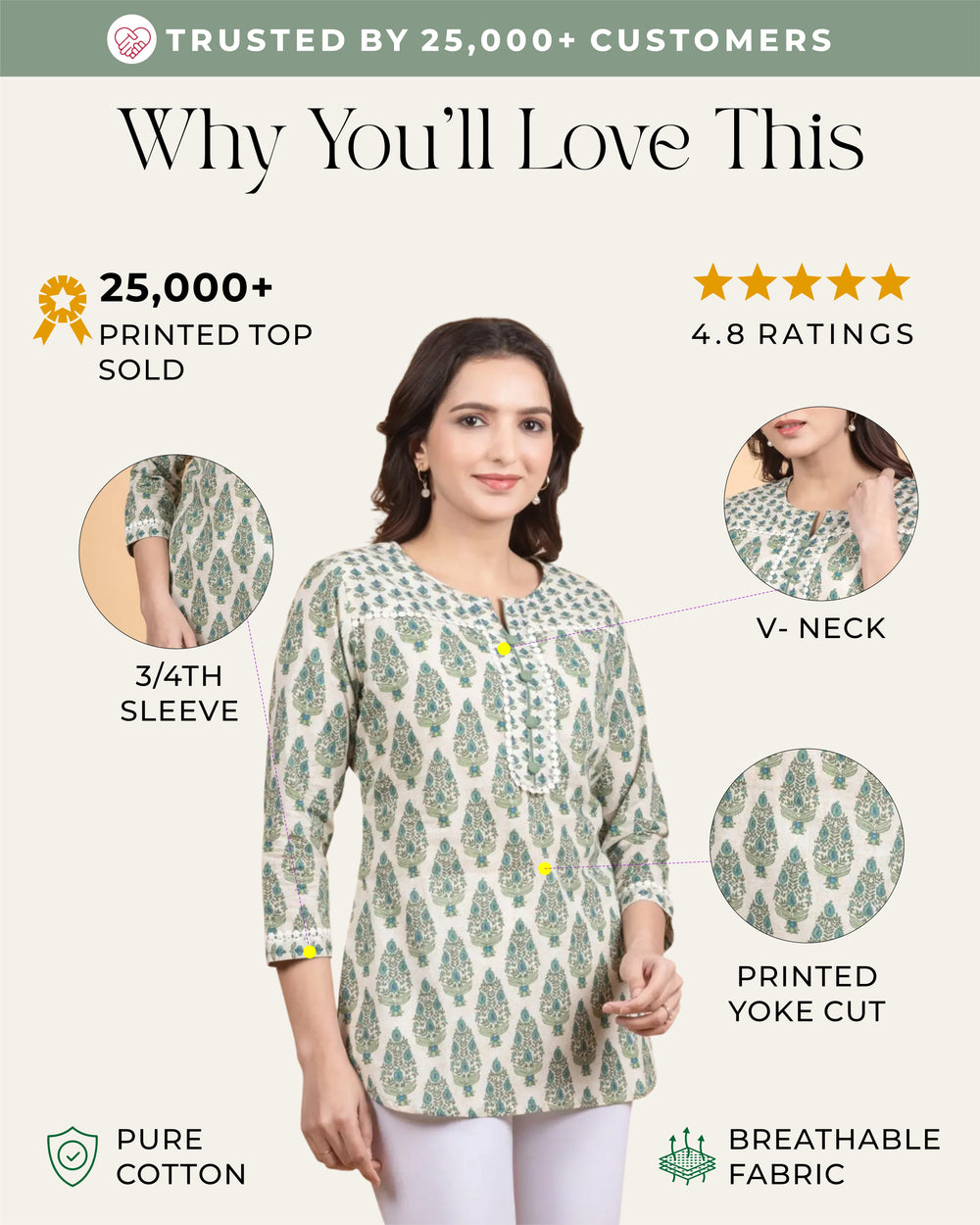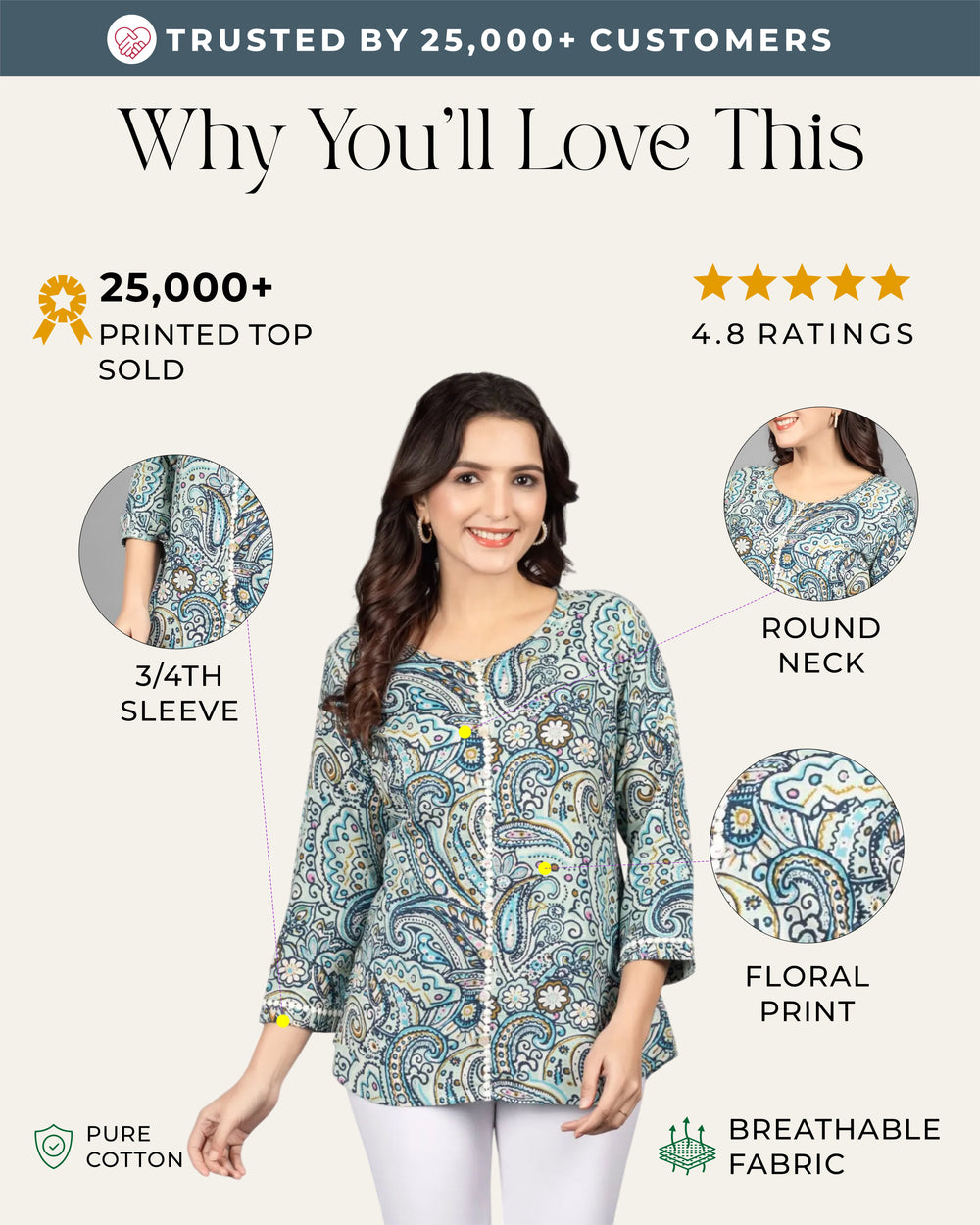 • Cream Color Top – The cream-colored top made from 100% Cotton material suits minimalists due to its light and neutral appearance.